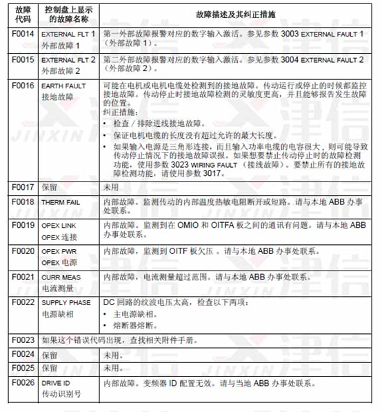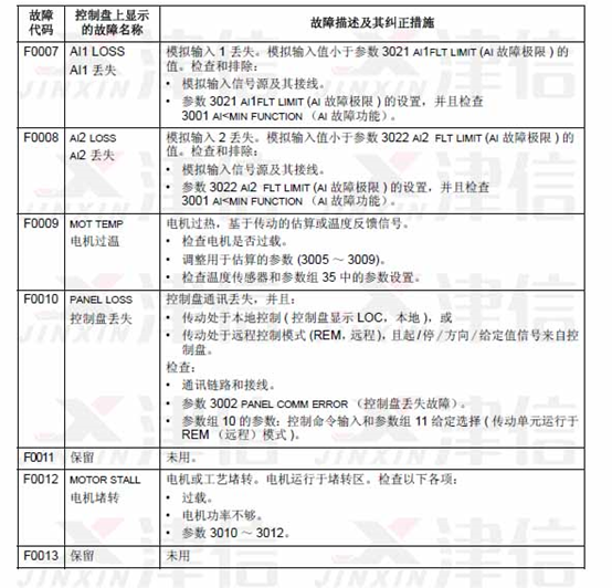 可以通過MENU/ENTER鍵來清除故障信息。如果故障依然存在,故障信息會(huì)在幾秒鐘后再次出現(xiàn)。此時(shí)需要根據(jù)故障代碼來進(jìn)行相應(yīng)的檢查和采取應(yīng)對(duì)措施。
